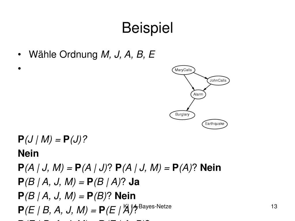 Beispiel • Wähle Ordnung M, J, A, B, E P(J | M) = P(J)? Nein P(A | J, M) = P(A | J)?P(A | J, M) = P(A)? Nein P(B | A, J, M) = P(B | A)? Ja P(B | A, J, M) = P(B)? Nein P(E | B, A, J, M) = P(E | A)? P(E | B, A, J, M) = P(E | A, B)? KI 14-Bayes-Netze