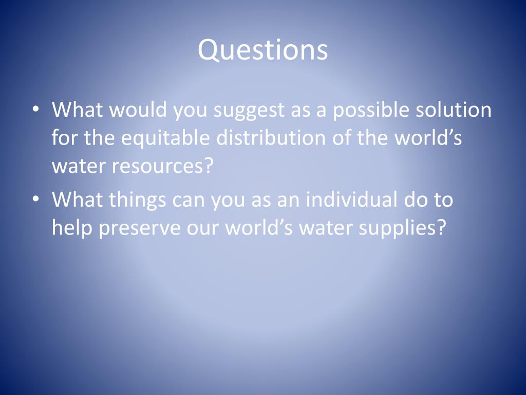 Questions • What would you suggest as a possible solution for the equitable distribution of the world’s water resources? • What things can you as an individual do to help preserve our world’s water supplies?