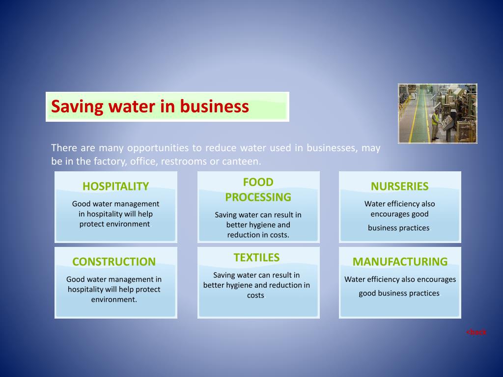 Saving water in business There are many opportunities to reduce water used in businesses, may be in the factory, office, restrooms or canteen. FOOD PROCESSING Saving water can result in better hygiene and reduction in costs. HOSPITALITY Good water management in hospitality will help protect environment. NURSERIES Water efficiency also encourages good business practices. TEXTILES Saving water can result in better hygiene and reduction in costs. CONSTRUCTION Good water management in hospitality will help protect environment. MANUFACTURING Water efficiency also encourages good business practices. <back