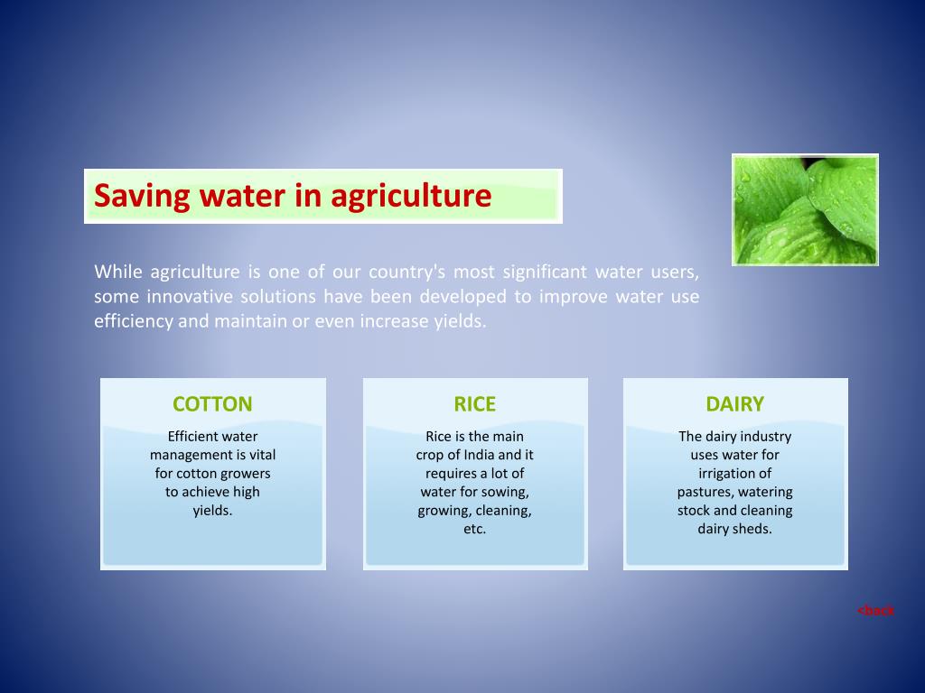Saving water in agriculture While agriculture is one of our country's most significant water users, some innovative solutions have been developed to improve water use efficiency and maintain or even increase yields. COTTON Efficient water management is vital for cotton growers to achieve high yields. RICE Rice is the main crop of India and it requires a lot of water for sowing, growing, cleaning, etc. DAIRY The dairy industry uses water for irrigation of pastures, watering stock and cleaning dairy sheds. <back