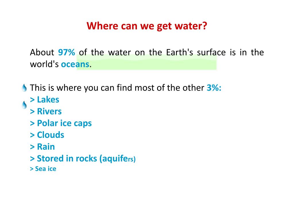 Where can we get water? About 97% of the water on the Earth's surface is in the world's oceans. This is where you can find most of the other 3%: > Lakes > Rivers > Polar ice caps > Clouds > Rain > Stored in rocks (aquifers) > Sea ice