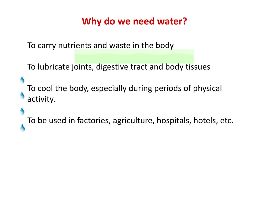 Why do we need water? To carry nutrients and waste in the body To lubricate joints, digestive tract and body tissues To cool the body, especially during periods of physical activity. To be used in factories, agriculture, hospitals, hotels, etc.