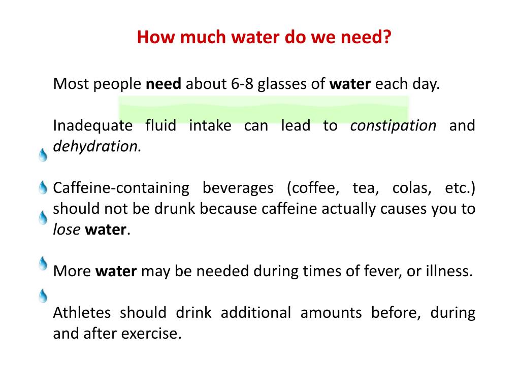 How much water do we need? Most people need about 6-8 glasses of water each day. Inadequate fluid intake can lead to constipation and dehydration. Caffeine-containing beverages (coffee, tea, colas, etc.) should not be drunk because caffeine actually causes you to lose water. More water may be needed during times of fever, or illness. Athletes should drink additional amounts before, during and after exercise.