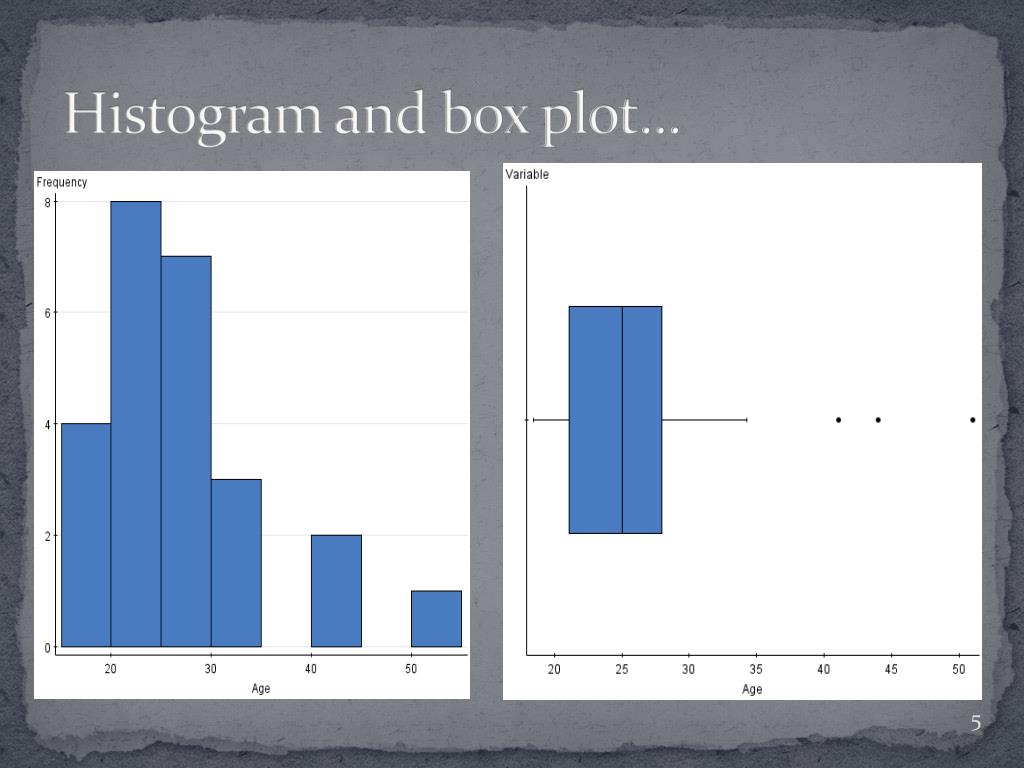 Data… • Age: 21.1 23.2 21.1 27.7 41.1 30.8 25.5 20.7 22.1 25.4 18.4 22.7 18.9 34.3 22.8 19.0 21.0 44.0 28.0 26.0 19.0 25.0 27.0 33.0 51.0 • Mean 26.752 • Median 25 Std. • Mode: 19, 21.1 • Standard Deviation. 8.329 • Range 32.6 • IQR 6.9 • Outliers 41.1, 51, 44