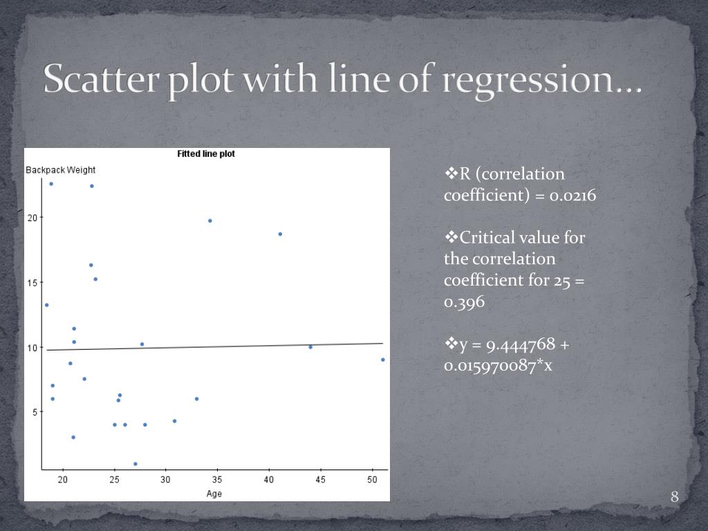 Variables… • Explanatory variable: Quantitative , age in years and months, example July and 22yrs. = 22.7 • Response variable: Weight of a 2-strap backpack in pounds.