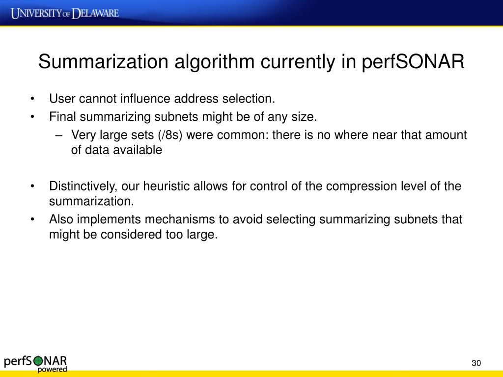 Summarization algorithm currently in perfSONAR • Relies on a voting scheme to identify subnets that represent most of the original IP addresses. • For each original address, algorithm expands all subnets. • Stores them into a list. • If a subnet was already expanded by a previous address, increment its vote counter. • Select candidates for summarizing addresses by picking subnets that have at least one original, /32 IP address child.