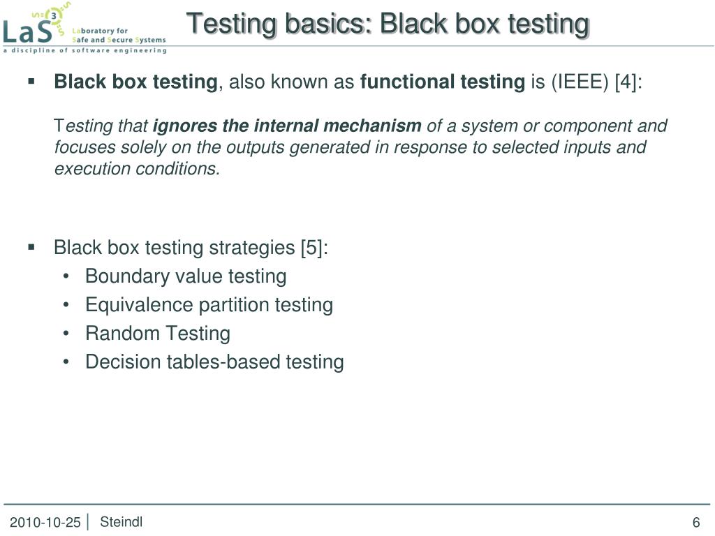 Testing basics: Black box testing • Black box testing, also known as functional testingis (IEEE) [4]:Testing that ignores the internal mechanism of a system or component and focuses solely on the outputs generated in response to selected inputs and execution conditions. • Black box testing strategies [5]: • Boundary value testing • Equivalence partition testing • Random Testing • Decision tables-based testing