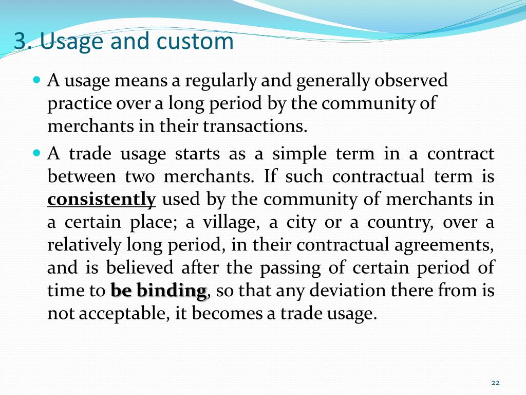 3. Usage and custom • A usage means a regularly and generally observed practice over a long period by the community of merchants in their transactions. • A trade usage starts as a simple term in a contract between two merchants. If such contractual term is consistently used by the community of merchants in a certain place; a village, a city or a country, over a relatively long period, in their contractual agreements, and is believed after the passing of certain period of time to be binding, so that any deviation there from is not acceptable, it becomes a trade usage.