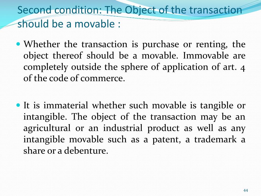 Second condition: The Object of the transaction should be a movable : • Whether the transaction is purchase or renting, the object thereof should be a movable. Immovable are completely outside the sphere of application of art. 4 of the code of commerce. • It is immaterial whether such movable is tangible or intangible. The object of the transaction may be an agricultural or an industrial product as well as any intangible movable such as a patent, a trademark a share or a debenture.