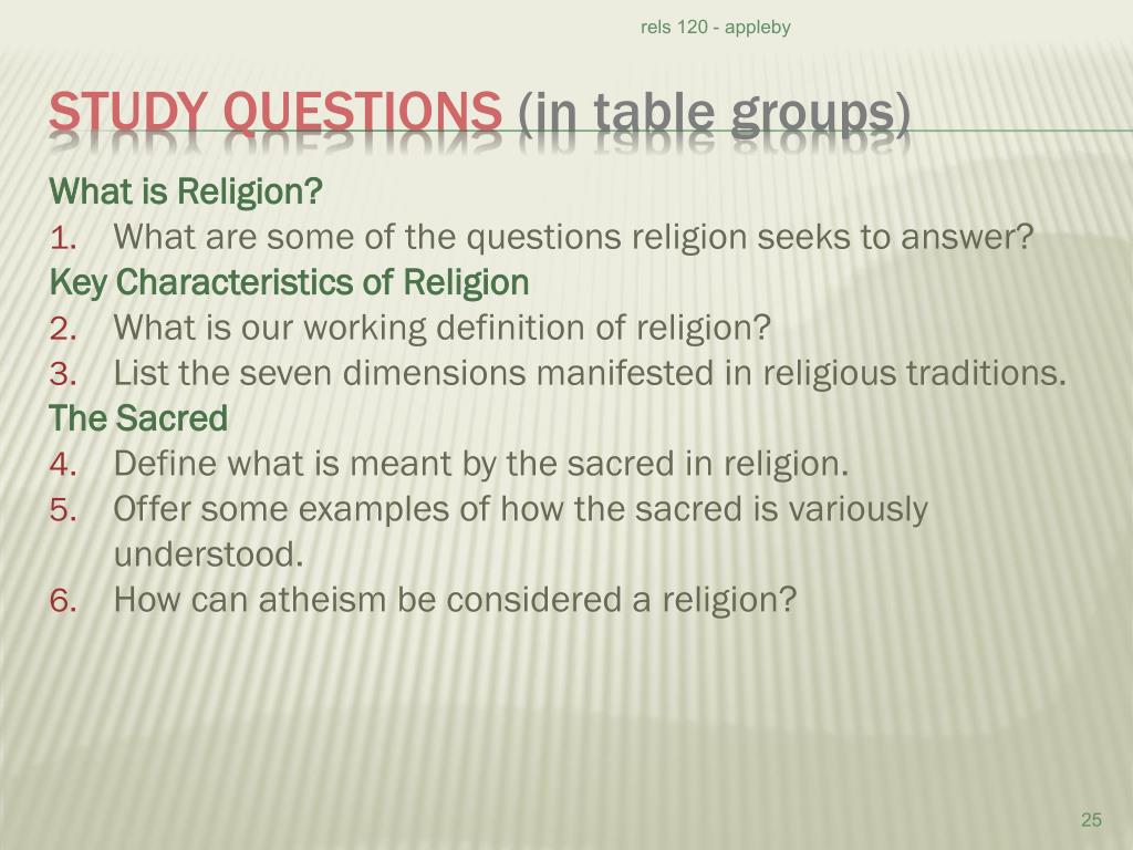 What is Religion? What are some of the questions religion seeks to answer? Key Characteristics of Religion What is our working definition of religion? List the seven dimensions manifested in religious traditions. The Sacred Define what is meant by the sacred in religion. Offer some examples of how the sacred is variously understood. How can atheism be considered a religion? rels 120 - appleby Study Questions (in table groups)