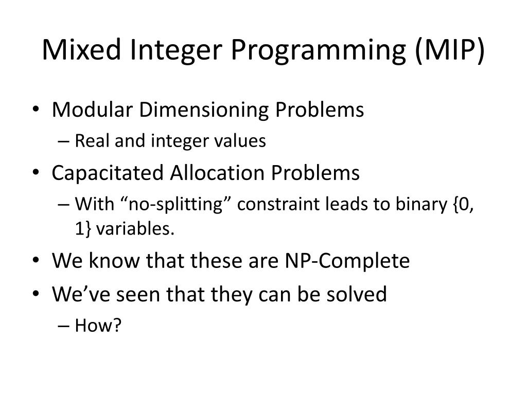 Mixed Integer Programming (MIP) • Modular Dimensioning Problems • Real and integer values • Capacitated Allocation Problems • With “no-splitting” constraint leads to binary {0, 1} variables. • We know that these are NP-Complete • We’ve seen that they can be solved • How?