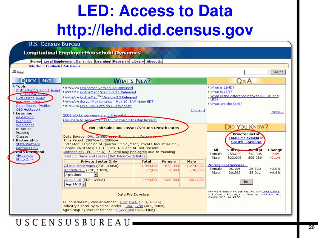 LED: Ongoing and Future Plans • Add data elements • race/ethnicity; education; firm age, size, and structure; occupation • Add data sources • Federal workers; self-employed • Enhance methodology/structure • Synchronize QWI with OnTheMap; state-based to national infrastructure • Build new data and products • Job-to-job flow statistics; national indicators; web-based tools