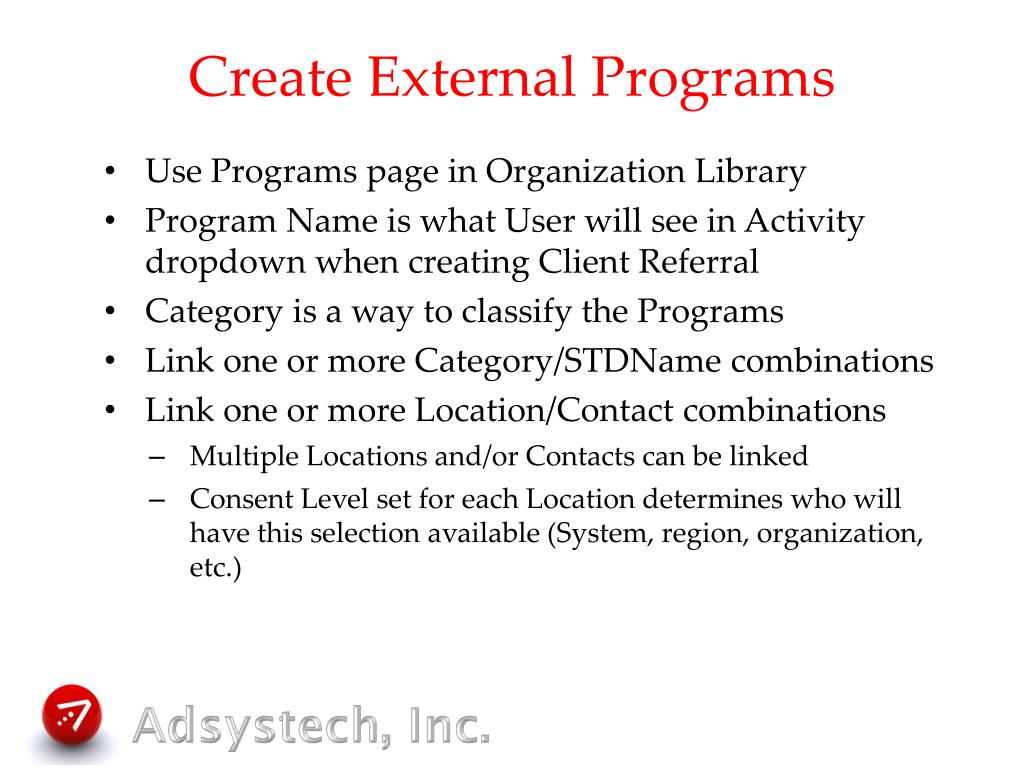 Create External Programs • Use Programs page in Organization Library • Program Name is what User will see in Activity dropdown when creating Client Referral • Category is a way to classify the Programs • Link one or more Category/STDName combinations • Link one or more Location/Contact combinations • Multiple Locations and/or Contacts can be linked • Consent Level set for each Location determines who will have this selection available (System, region, organization, etc.)