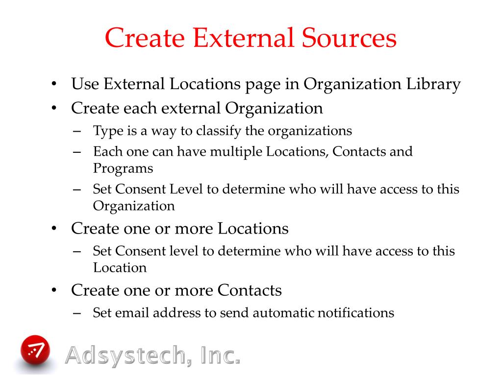 Create External Sources • Use External Locations page in Organization Library • Create each external Organization • Type is a way to classify the organizations • Each one can have multiple Locations, Contacts and Programs • Set Consent Level to determine who will have access to this Organization • Create one or more Locations • Set Consent level to determine who will have access to this Location • Create one or more Contacts • Set email address to send automatic notifications