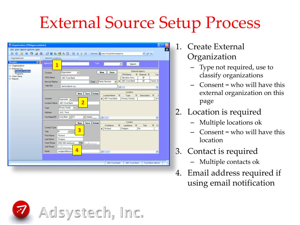 External Source Setup Process 1 2 3 4 • Create External Organization • Type not required, use to classify organizations • Consent = who will have this external organization on this page • Location is required • Multiple locations ok • Consent = who will have this location • Contact is required • Multiple contacts ok • Email address required if using email notification