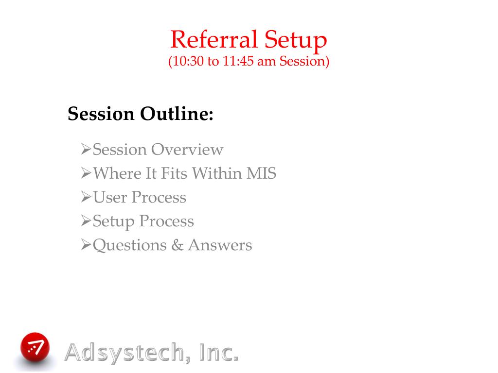 Referral Setup (10:30 to 11:45 am Session) Session Overview Where It Fits Within MIS User Process Setup Process Questions & Answers Session Outline: