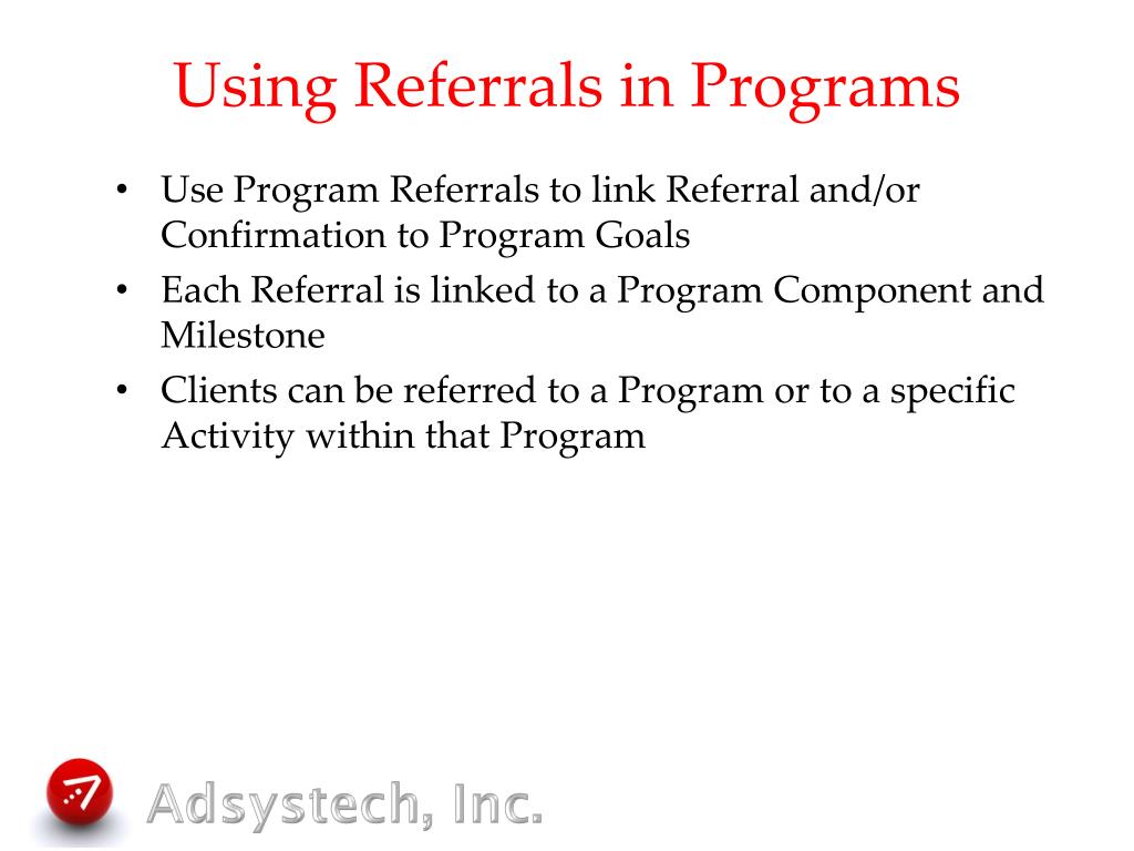 Using Referrals in Programs Use Program Referrals to link Referral and/or Confirmation to Program Goals Each Referral is linked to a Program Component and Milestone Clients can be referred to a Program or to a specific Activity within that Program