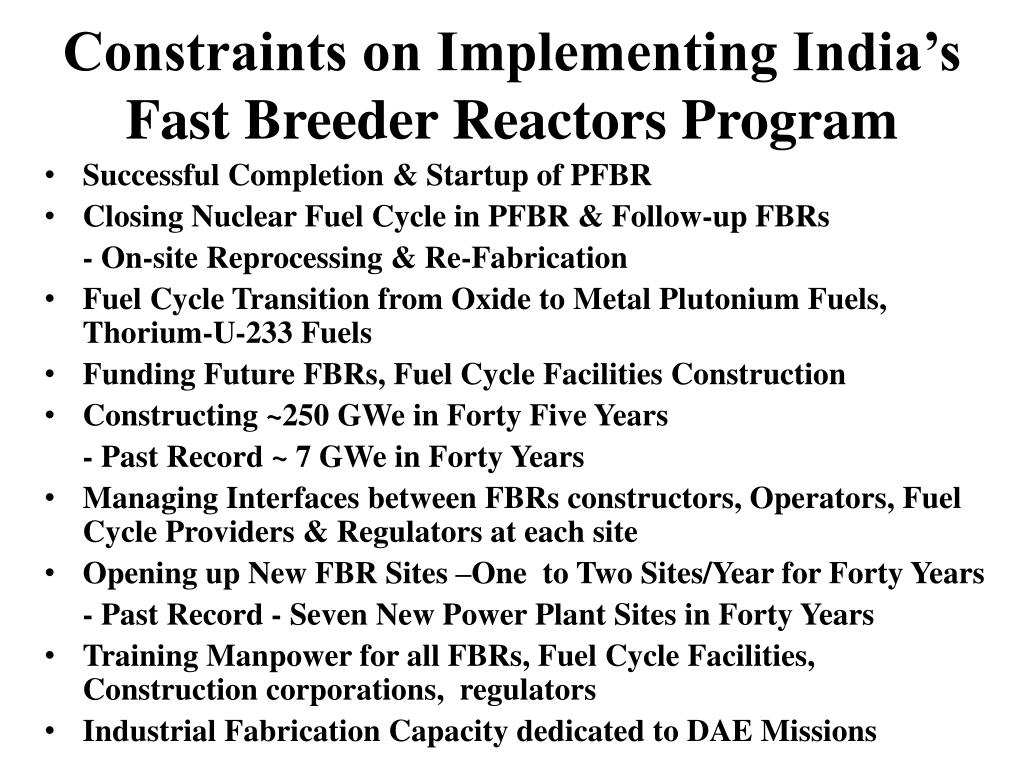Constraints on Implementing India’s Fast Breeder Reactors Program • Successful Completion & Startup of PFBR • Closing Nuclear Fuel Cycle in PFBR & Follow-up FBRs - On-site Reprocessing & Re-Fabrication • Fuel Cycle Transition from Oxide to Metal Plutonium Fuels, Thorium-U-233 Fuels • Funding Future FBRs, Fuel Cycle Facilities Construction • Constructing ~250 GWe in Forty Five Years - Past Record ~ 7 GWe in Forty Years • Managing Interfaces between FBRs constructors, Operators, Fuel Cycle Providers & Regulators at each site • Opening up New FBR Sites –One to Two Sites/Year for Forty Years - Past Record - Seven New Power Plant Sites in Forty Years • Training Manpower for all FBRs, Fuel Cycle Facilities, Construction corporations, regulators • Industrial Fabrication Capacity dedicated to DAE Missions