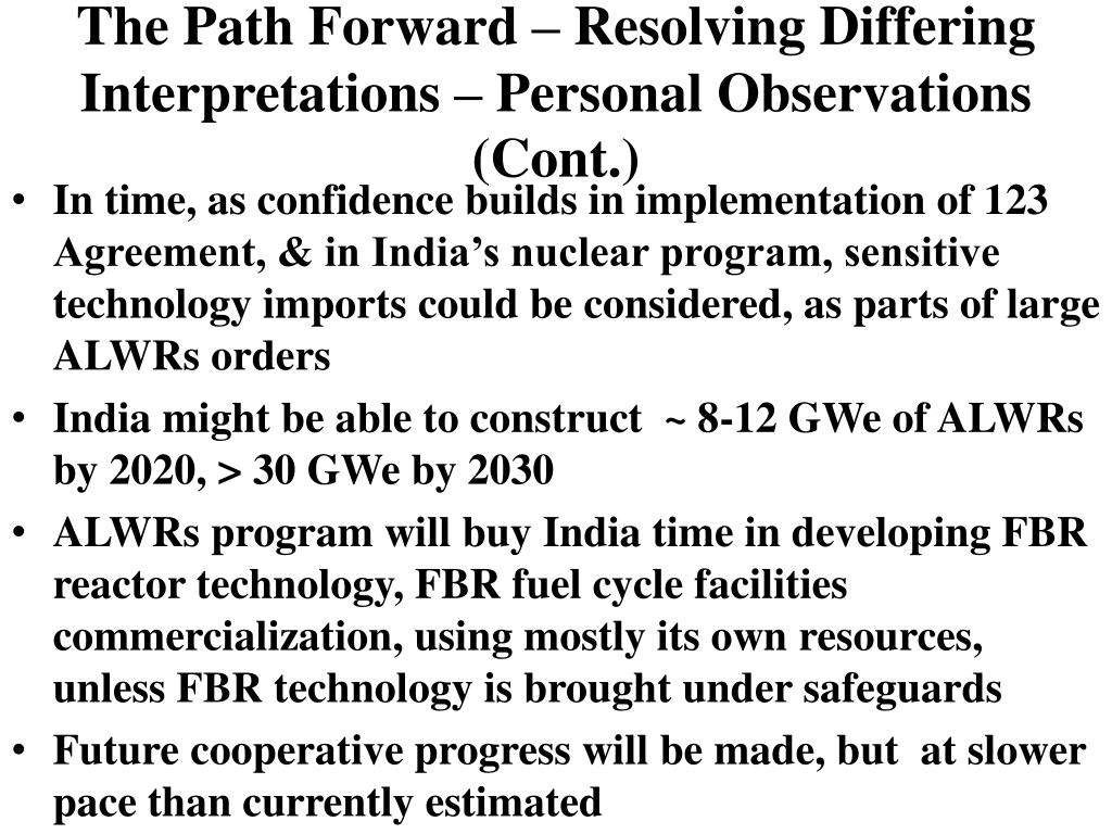 The Path Forward – Resolving Differing Interpretations – Personal Observations (Cont.) • In time, as confidence builds in implementation of 123 Agreement, & in India’s nuclear program, sensitive technology imports could be considered, as parts of large ALWRs orders • India might be able to construct ~ 8-12 GWe of ALWRs by 2020, > 30 GWe by 2030 • ALWRs program will buy India time in developing FBR reactor technology, FBR fuel cycle facilities commercialization, using mostly its own resources, unless FBR technology is brought under safeguards • Future cooperative progress will be made, but at slower pace than currently estimated