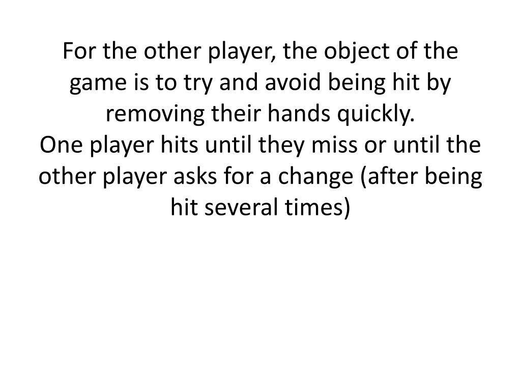 For the other player, the object of the game is to try and avoid being hit by removing their hands quickly.One player hits until they miss or until the other player asks for a change (after being hit several times)