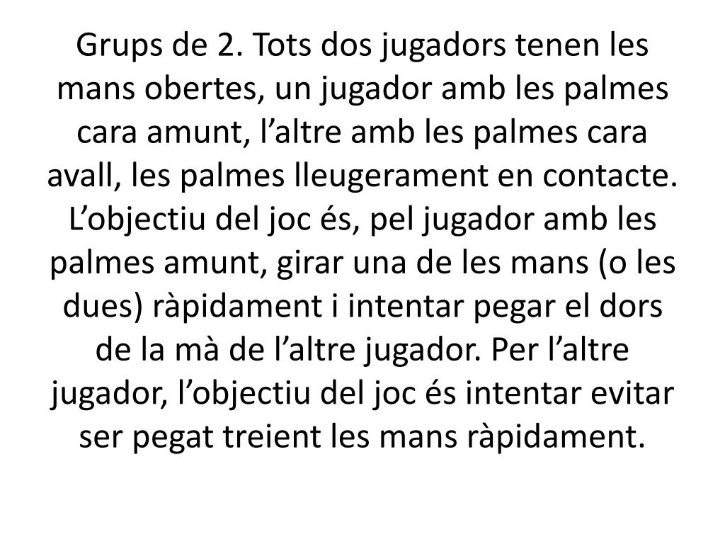 Grups de 2. Tots dos jugadors tenen les mans obertes, un jugador amb les palmes cara amunt, l’altre amb les palmes cara avall, les palmes lleugerament en contacte. L’objectiu del joc és, pel jugador amb les palmes amunt, girar una de les mans (o les dues) ràpidament i intentar pegar el dors de la mà de l’altre jugador. Per l’altre jugador, l’objectiu del joc és intentar evitar ser pegat treient les mans ràpidament.