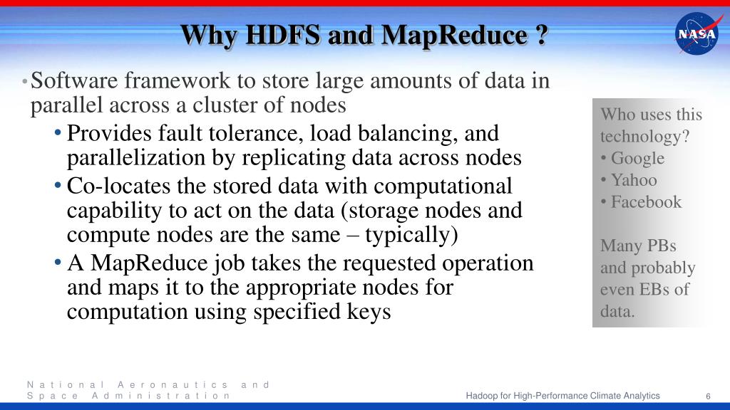 Why HDFS and MapReduce ? • Who uses this technology? • Google • Yahoo • Facebook • Many PBs and probably even EBs of data. • Software framework to store large amounts of data in parallel across a cluster of nodes • Provides fault tolerance, load balancing, and parallelization by replicating data across nodes • Co-locates the stored data with computational capability to act on the data (storage nodes and compute nodes are the same – typically) • A MapReduce job takes the requested operation and maps it to the appropriate nodes for computation using specified keys Hadoop for High-Performance Climate Analytics