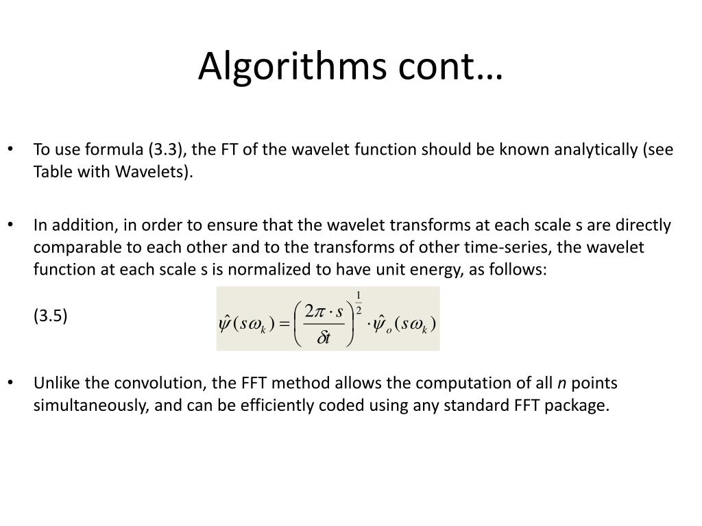 Algorithms cont… • To use formula (3.3), the FT of the wavelet function should be known analytically (see Table with Wavelets). • In addition, in order to ensure that the wavelet transforms at each scale s are directly comparable to each other and to the transforms of other time-series, the wavelet function at each scale s is normalized to have unit energy, as follows: (3.5) • Unlike the convolution, the FFT method allows the computation of all n points simultaneously, and can be efficiently coded using any standard FFT package.