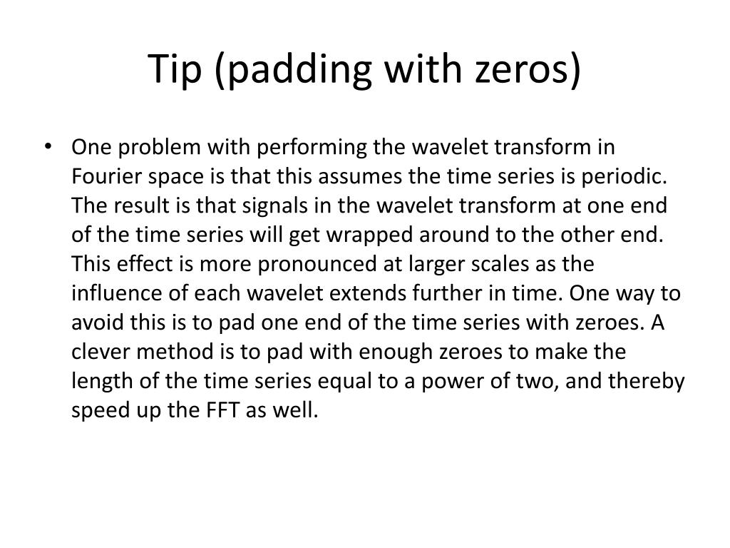 Tip (padding with zeros) • One problem with performing the wavelet transform in Fourier space is that this assumes the time series is periodic. The result is that signals in the wavelet transform at one end of the time series will get wrapped around to the other end. This effect is more pronounced at larger scales as the influence of each wavelet extends further in time. One way to avoid this is to pad one end of the time series with zeroes. A clever method is to pad with enough zeroes to make the length of the time series equal to a power of two, and thereby speed up the FFT as well.