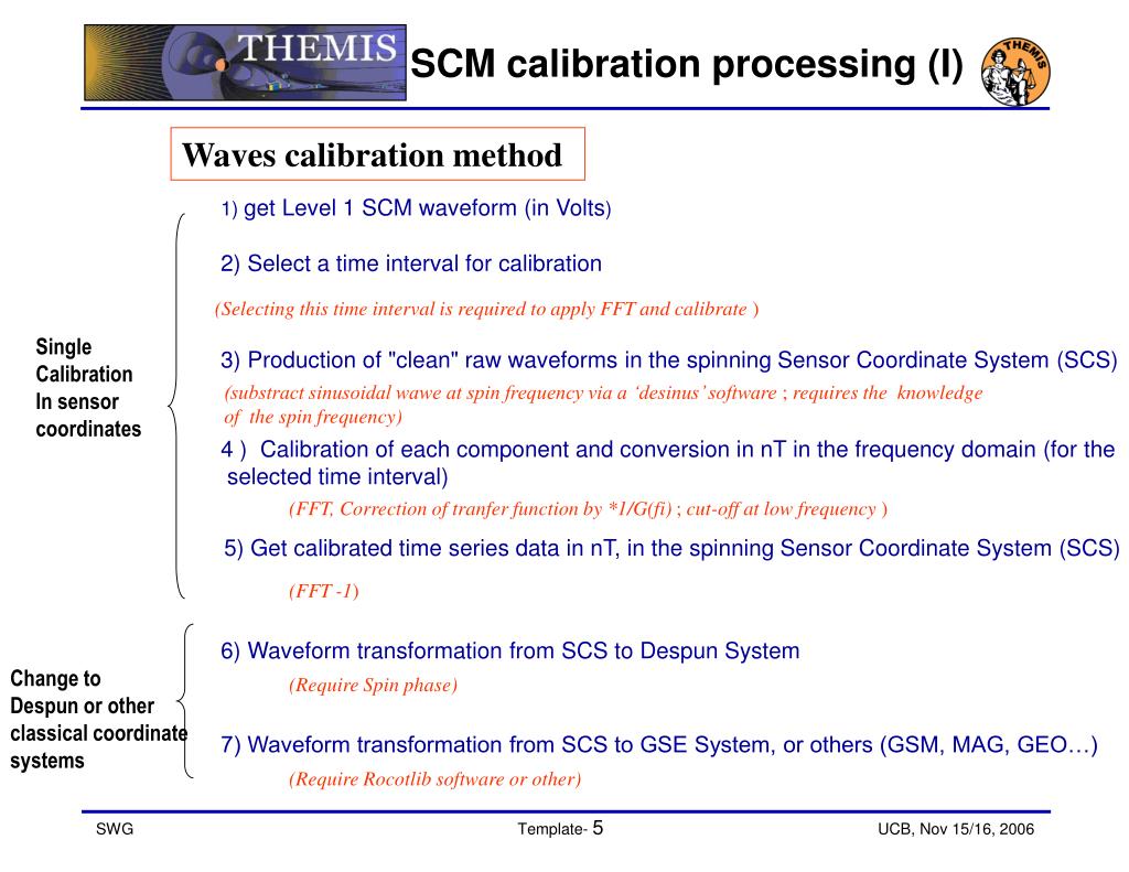SCM calibration processing (I) Waves calibration method 1) get Level 1SCM waveform (in Volts) 2) Select a time interval for calibration (Selecting this time interval is required to apply FFT and calibrate ) Single Calibration In sensor coordinates 3) Production of "clean" raw waveforms in the spinning Sensor Coordinate System (SCS) (substract sinusoidal wawe at spin frequency via a ‘desinus’ software ; requires the knowledge of the spin frequency) 4 ) Calibration of each component and conversion in nT in the frequency domain (for the selected time interval) (FFT, Correction of tranfer function by *1/G(fi) ; cut-off at low frequency ) 5) Get calibrated time series data in nT, in the spinning Sensor Coordinate System (SCS) (FFT -1) 6) Waveform transformation from SCS to Despun System Change to Despun or other classical coordinate systems (Require Spin phase) 7) Waveform transformation from SCS to GSE System, or others (GSM, MAG, GEO…) (Require Rocotlib software or other)
