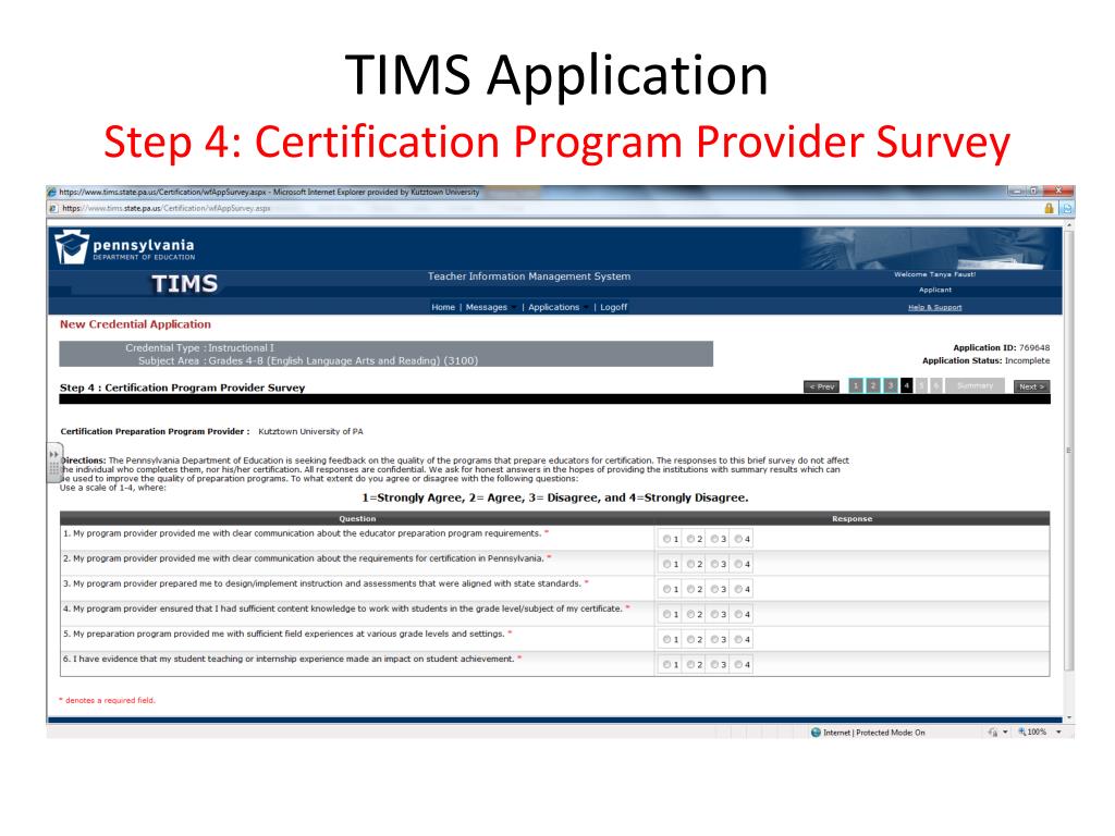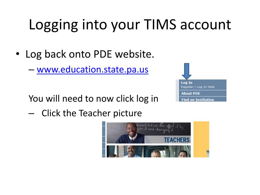 TIMS (Teacher Information Management System). Applying for your Teacher Certification. Registering for TIMS. Please fill in the information Your username and password will be created here. . Logging into your TIMS account. Log back onto PDE website. www.education.state.pa.us