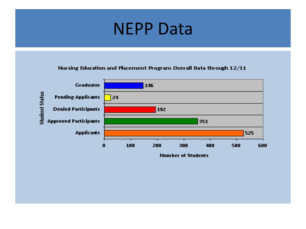 Nursing Education and Placement Program (NEPP) • US Department of Labor, Education and Training Administration, American Recovery and Reinvestment Act funded program • Grant Award: $ 4,655,799.00 • Effective Dates: March 1, 2010 through February 28, 2013