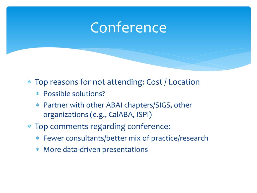 Conference • Top reasons for not attending: Cost / Location • Possible solutions? • Partner with other ABAI chapters/SIGS, other organizations (e.g., CalABA, ISPI) • Top comments regarding conference: • Fewer consultants/better mix of practice/research • More data-driven presentations