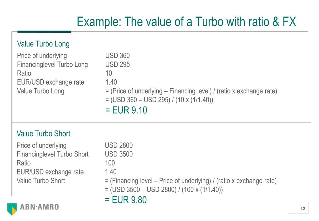 Example: The value of a Turbo with ratio & FX • Value Turbo Long • Price of underlying USD 360 • Financinglevel Turbo Long USD 295 • Ratio 10 • EUR/USD exchange rate 1.40 • Value Turbo Long = (Price of underlying – Financing level) / (ratio x exchange rate) • = (USD 360 – USD 295) / (10 x (1/1.40)) • = EUR 9.10 • Value Turbo Short • Price of underlying USD 2800 • Financinglevel Turbo Short USD 3500 • Ratio 100 • EUR/USD exchange rate 1.40 • Value Turbo Short = (Financing level – Price of underlying) / (ratio x exchange rate) • = (USD 3500 – USD 2800) / (100 x (1/1.40)) • = EUR 9.80