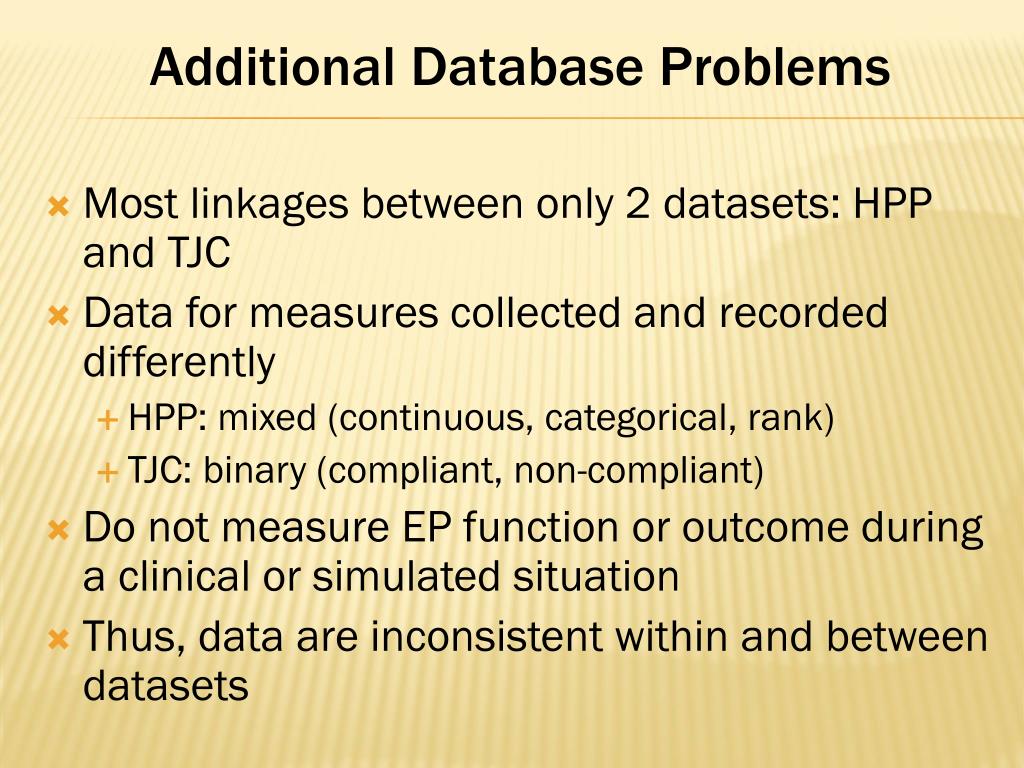 Additional Database Problems Most linkages between only 2 datasets: HPP and TJC Data for measures collected and recorded differently HPP: mixed (continuous, categorical, rank) TJC: binary (compliant, non-compliant) Do not measure EP function or outcome during a clinical or simulated situation Thus, data are inconsistent within and between datasets