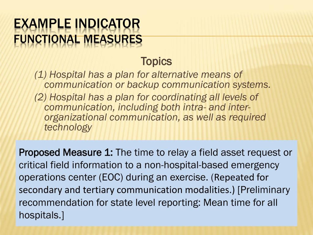 Topics (1) Hospital has a plan for alternative means of communication or backup communication systems. (2) Hospital has a plan for coordinating all levels of communication, including both intra- and inter-organizational communication, as well as required technology Example indicator Functional Measures Proposed Measure 1: The time to relay a field asset request or critical field information to a non-hospital-based emergency operations center (EOC) during an exercise. (Repeated for secondary and tertiary communication modalities.) [Preliminary recommendation for state level reporting: Mean time for all hospitals.]