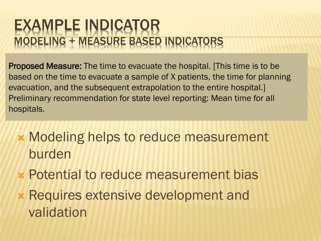 Modeling helps to reduce measurement burden Potential to reduce measurement bias Requires extensive development and validation Example IndicatorModeling + Measure Based Indicators Proposed Measure: The time to evacuate the hospital. [This time is to be based on the time to evacuate a sample of X patients, the time for planning evacuation, and the subsequent extrapolation to the entire hospital.] Preliminary recommendation for state level reporting: Mean time for all hospitals.