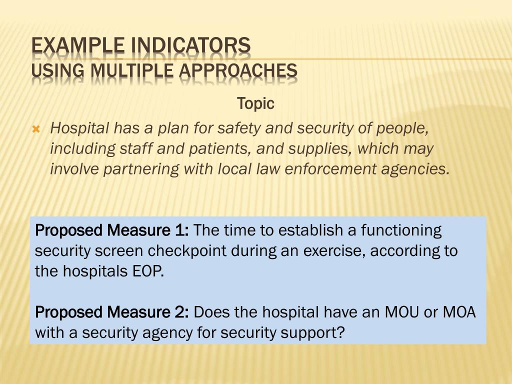 Topic Hospital has a plan for safety and security of people, including staff and patients, and supplies, which may involve partnering with local law enforcement agencies. Example Indicators Using multiple approaches Proposed Measure 1: The time to establish a functioning security screen checkpoint during an exercise, according to the hospitals EOP. Proposed Measure 2: Does the hospital have an MOU or MOA with a security agency for security support?