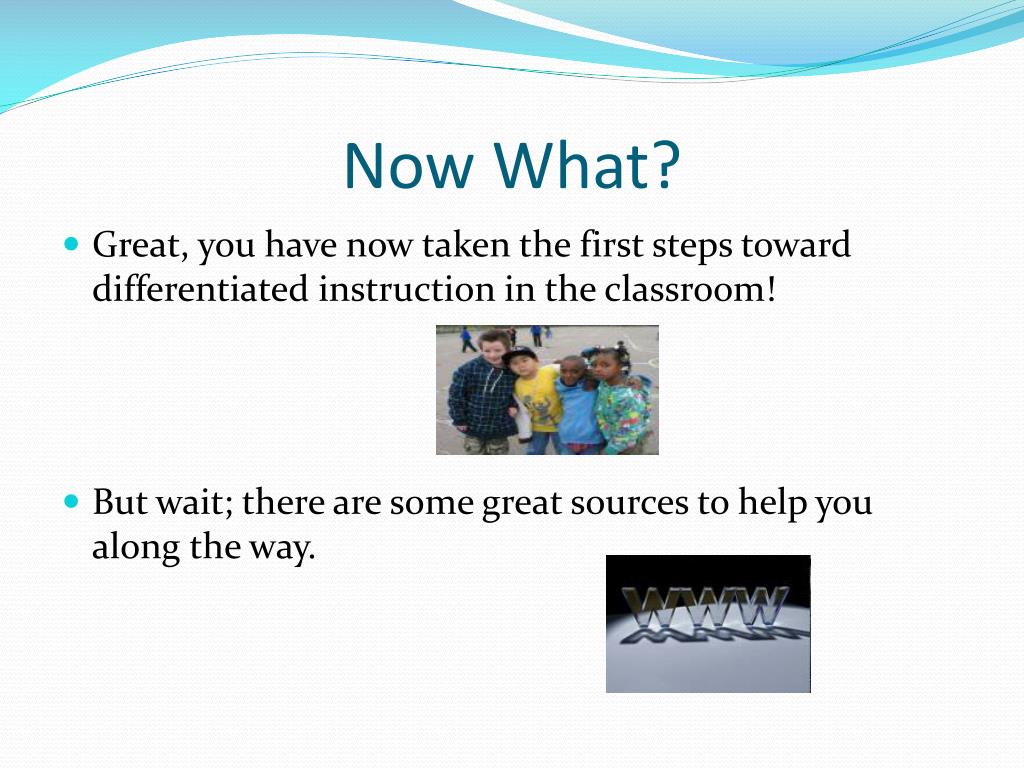 Now What? • Great, you have now taken the first steps toward differentiated instruction in the classroom! • But wait; there are some great sources to help you along the way.