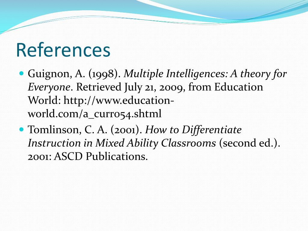 References • Guignon, A. (1998). Multiple Intelligences: A theory for Everyone. Retrieved July 21, 2009, from Education World: http://www.education-world.com/a_curr054.shtml • Tomlinson, C. A. (2001). How to Differentiate Instruction in Mixed Ability Classrooms (second ed.). 2001: ASCD Publications.