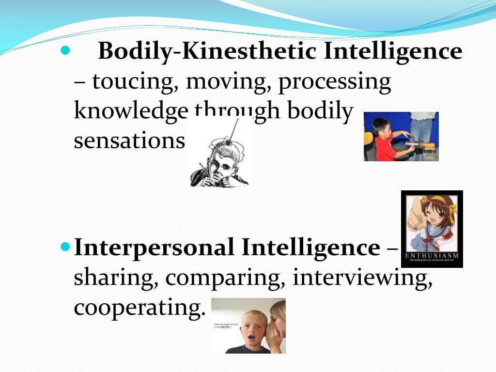 Bodily-KinestheticIntelligence – toucing, moving, processing knowledge through bodily sensations • Interpersonal Intelligence – sharing, comparing, interviewing, cooperating.