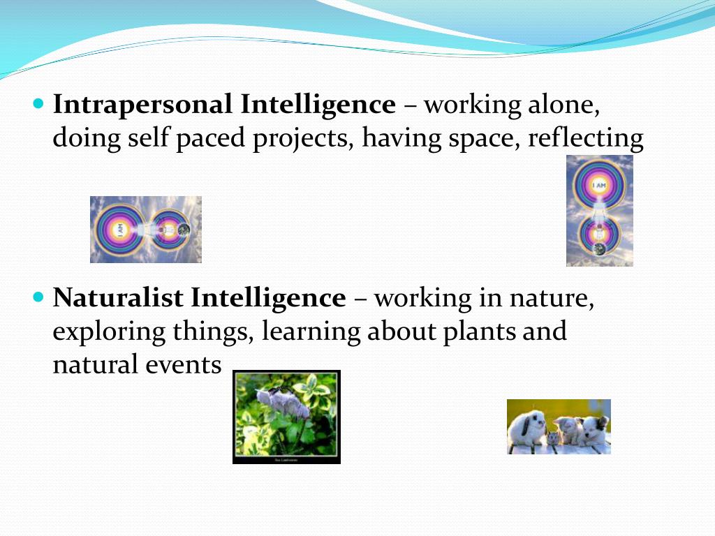 Intrapersonal Intelligence– working alone, doing self paced projects, having space, reflecting • Naturalist Intelligence– working in nature, exploring things, learning about plants and natural events