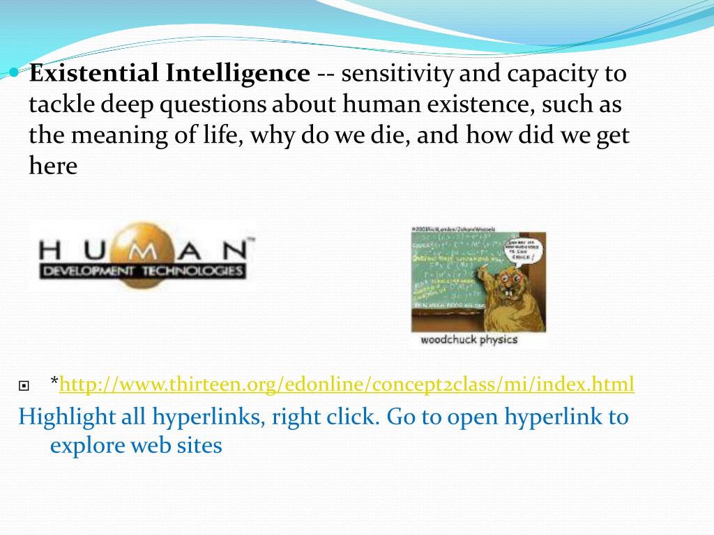 Existential Intelligence -- sensitivity and capacity to tackle deep questions about human existence, such as the meaning of life, why do we die, and how did we get here • *http://www.thirteen.org/edonline/concept2class/mi/index.html Highlight all hyperlinks, right click. Go to open hyperlink to explore web sites