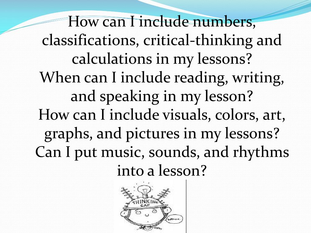 How can I include numbers, classifications, critical-thinking and calculations in my lessons? When can I include reading, writing, and speaking in my lesson? How can I include visuals, colors, art, graphs, and pictures in my lessons? Can I put music, sounds, and rhythms into a lesson?