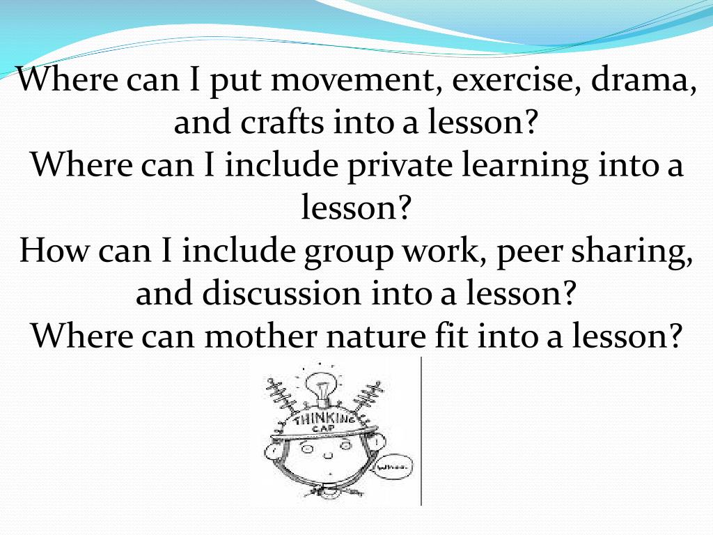 Where can I put movement, exercise, drama, and crafts into a lesson? Where can I include private learning into a lesson? How can I include group work, peer sharing, and discussion into a lesson? Where can mother nature fit into a lesson?