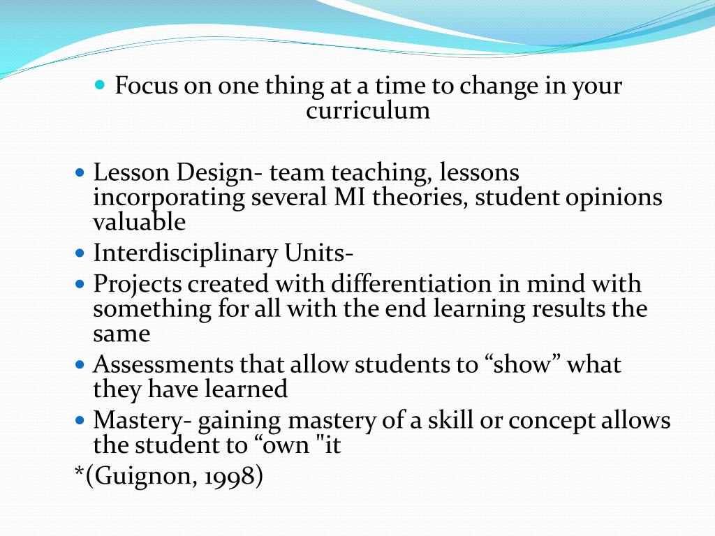 Focus on one thing at a time to change in your curriculum • Lesson Design- team teaching, lessons incorporating several MI theories, student opinions valuable • Interdisciplinary Units- • Projects created with differentiation in mind with something for all with the end learning results the same • Assessments that allow students to “show” what they have learned • Mastery- gaining mastery of a skill or concept allows the student to “own "it *(Guignon, 1998)