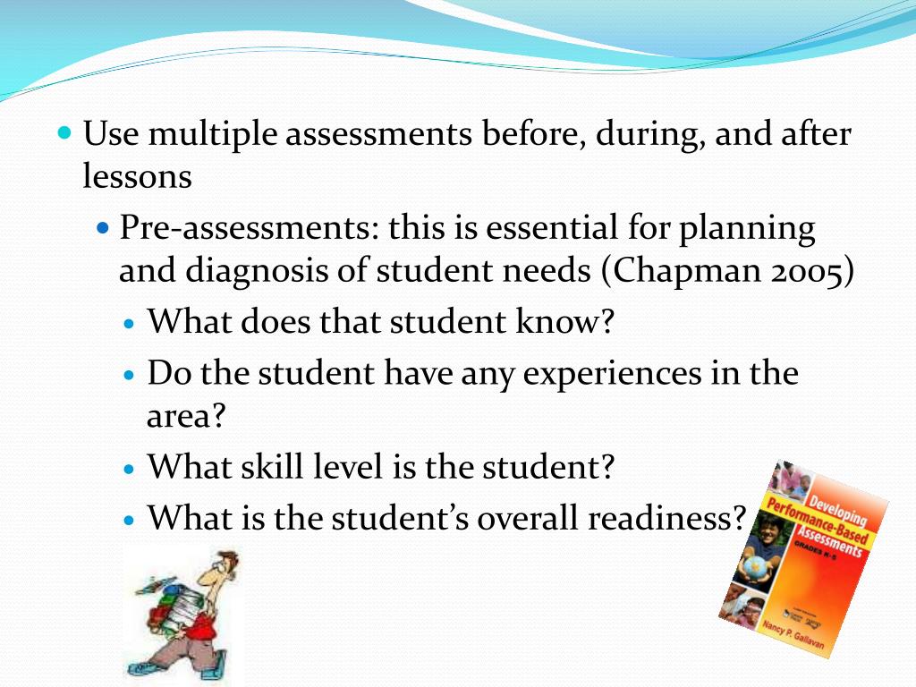 Use multiple assessments before, during, and after lessons • Pre-assessments: this is essential for planning and diagnosis of student needs (Chapman 2005) • What does that student know? • Do the student have any experiences in the area? • What skill level is the student? • What is the student’s overall readiness?