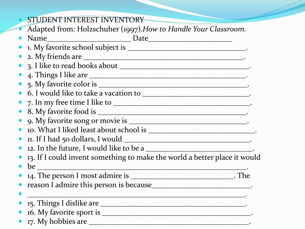 STUDENT INTEREST INVENTORY • Adapted from: Holzschuher (1997).How to Handle Your Classroom. • Name______________________ Date______________________ • 1. My favorite school subject is _______________________________. • 2. My friends are __________________________________________. • 3. I like to read books about __________________________________. • 4. Things I like are _________________________________________. • 5. My favorite color is _______________________________________. • 6. I would like to take a vacation to ____________________________. • 7. In my free time I like to ____________________________________. • 8. My favorite food is _______________________________________. • 9. My favorite song or movie is _______________________________. • 10. What I liked least about school is ____________________________. • 11. If I had 50 dollars, I would _________________________________. • 12. In the future, I would like to be a ____________________________. • 13. If I could invent something to make the world a better place it would • be _______________________________________________________. • 14. The person I most admire is ___________________________. The • reason I admire this person is because__________________________. • _________________________________________________________. • 15. Things I dislike are ______________________________________. • 16. My favorite sport is _______________________________________. • 17. My hobbies are __________________________________________.