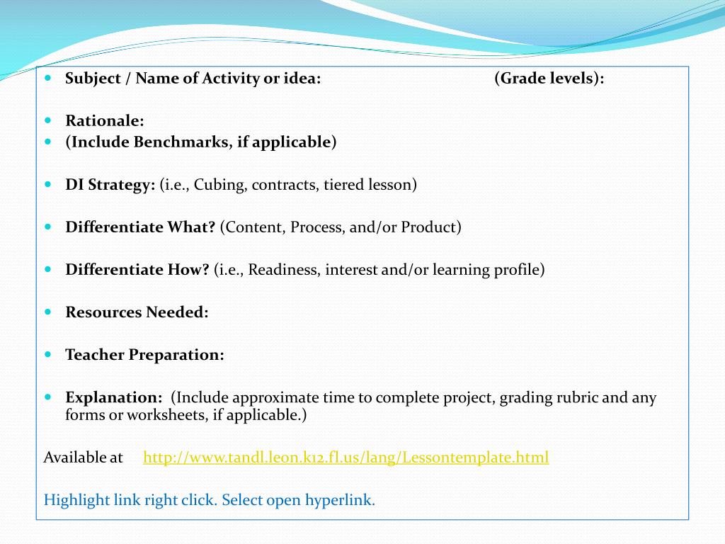 Differentiated Lesson Plan TemplateGrade Level_______________ Developed by__________________Subject___________________ Concept_______________________Planning: What Students will: KNOW UNDERSTAND DO Standards, content Principles, Generalizations Objectives, Outcomes1 1 12. 2. 23. 3 34. 4 4 Essential Questions:Pre-Assessment:Assessment:Number of StudentsLevel oneLevel twoLevel ThreeLevel FourRe-teaching Concepts: • Subject / Name of Activity or idea:(Grade levels): • Rationale: • (Include Benchmarks, if applicable) • DI Strategy: (i.e., Cubing, contracts, tiered lesson) • Differentiate What? (Content, Process, and/or Product) • Differentiate How? (i.e., Readiness, interest and/or learning profile) • Resources Needed: • Teacher Preparation: • Explanation: (Include approximate time to complete project, grading rubric and any forms or worksheets, if applicable.) Available at http://www.tandl.leon.k12.fl.us/lang/Lessontemplate.html Highlight link right click. Select open hyperlink.
