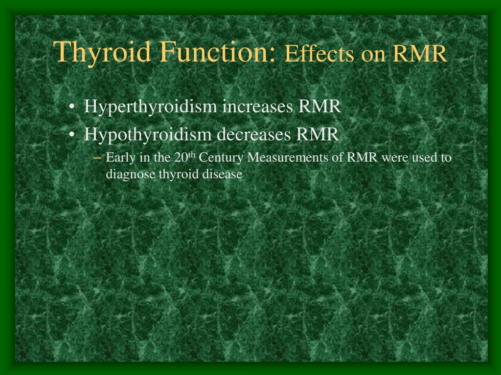 Thyroid Function: Effects on RMR • Hyperthyroidism increases RMR • Hypothyroidism decreases RMR • Early in the 20th Century Measurements of RMR were used to diagnose thyroid disease