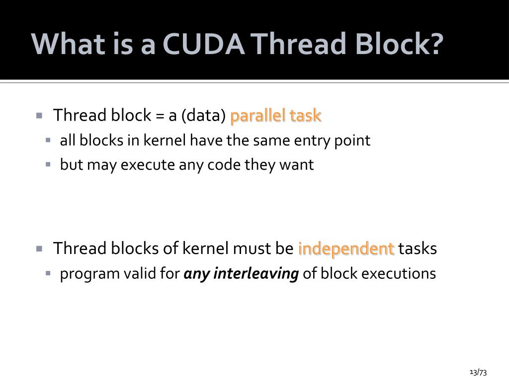 What is a CUDA Thread Block? • Thread block = a (data) parallel task • all blocks in kernel have the same entry point • but may execute any code they want • Thread blocks of kernel must be independent tasks • program valid for any interleaving of block executions